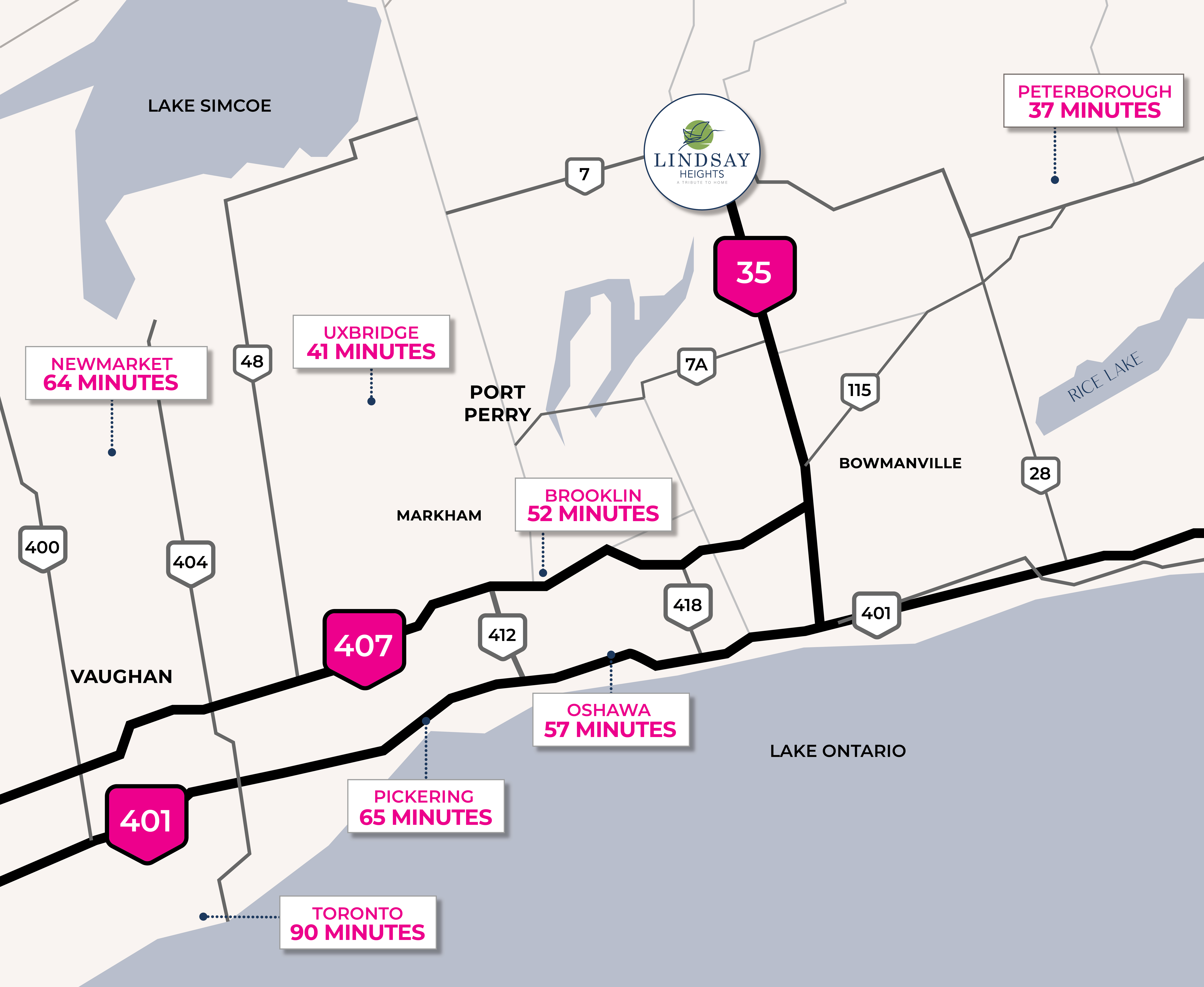 Introducing Lindsay Heights, a new home community of freehold townhomes & semis, 30', 36', 40' detached designs at Highway 35 and Thunder Bridge Road. With a range of lot sizes, and house styles, this master planned community will be a place for all. The small town, country charm of Lindsay has a variety of modern amenities, as well as a lovely scenic downtown.